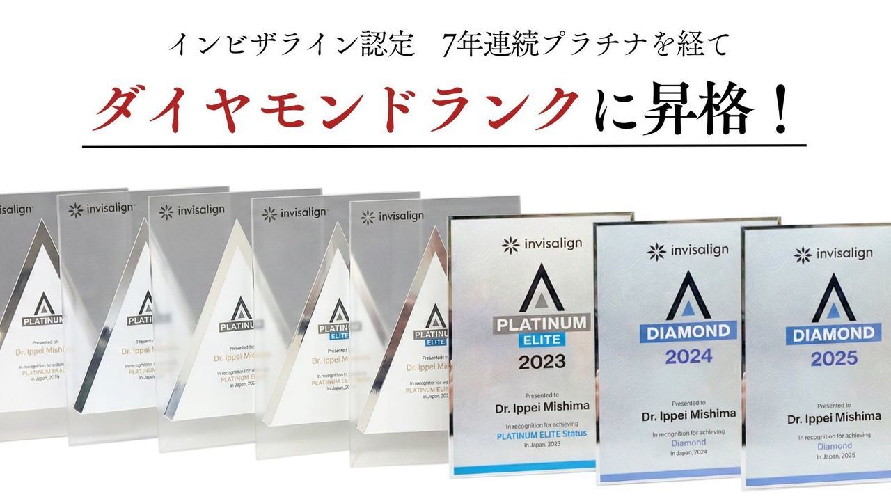 当院の三嶋一平医師は、2017〜2020年は「プラチナ」、2021〜2023年はさらに1つ上の「プラチナ・エリート」、2024年にはついに「ダイヤモンド」に認定され、9年連続でプラチナ以上にランキング。いわばマウスピース矯正のプロフェッショナルです。